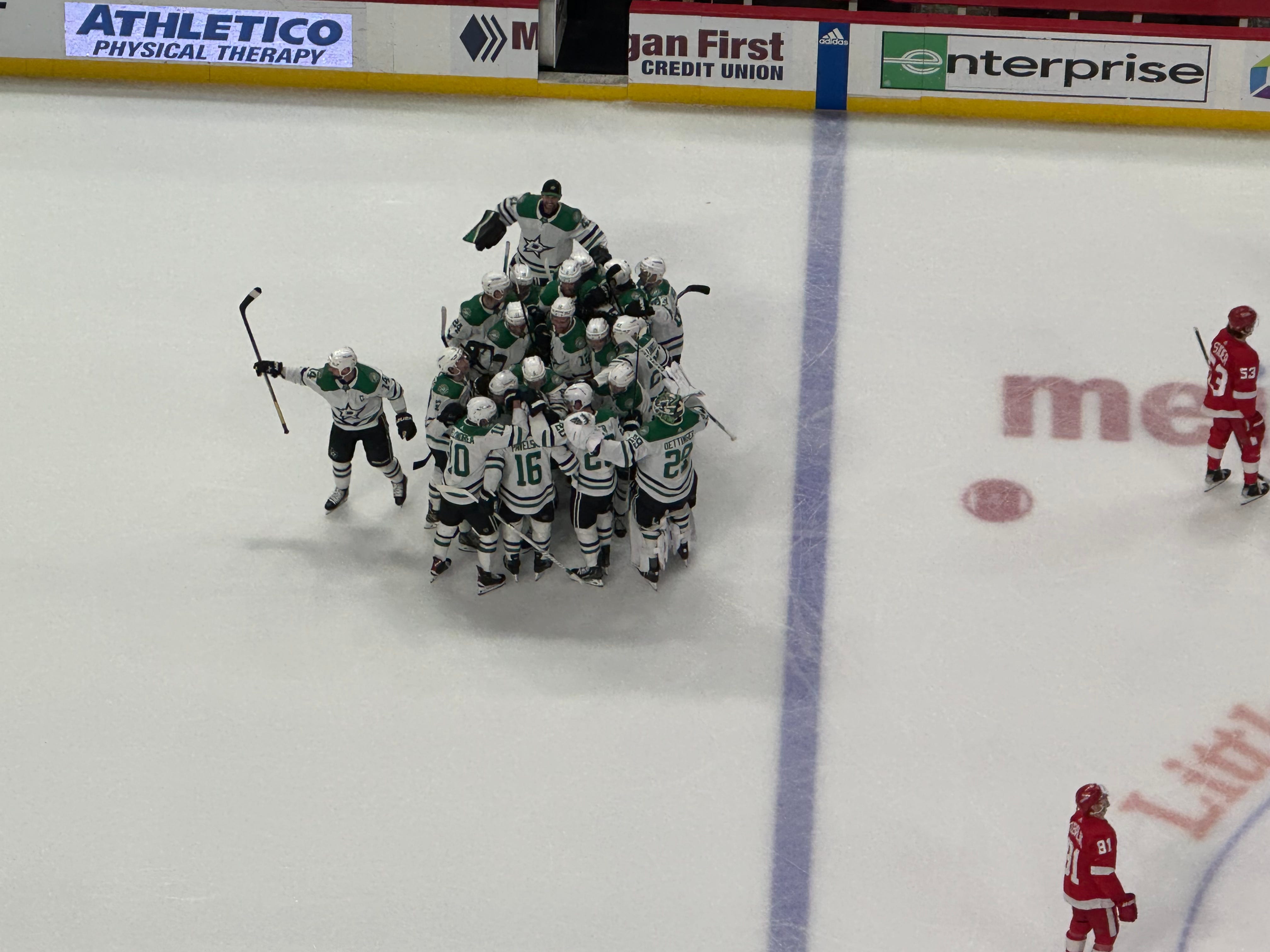The benches cleared, Pavelski got the group celebration like Giroux got with Ottawa and the Detroit crowd gave a nice ovation when it was announced why the Stars had cleared the bench.