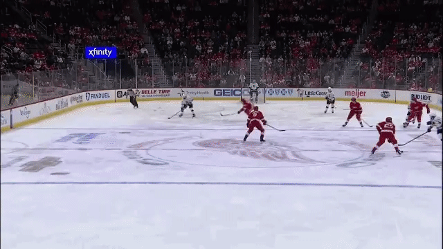 And that’s how he scored in the first period, pulling the trigger while using Moritz Seider as a screen, to beat Detroit goalie Ville Husso.