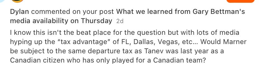 Just because Tanev used the tax situation to stay in Canada, doesn’t mean Marner or Tavares will. But it’s important thing to at least remember, because if we are going to blindly talk about about how “Marner will sign in a no-tax state” on Twitter, we should at least bring in some more context.