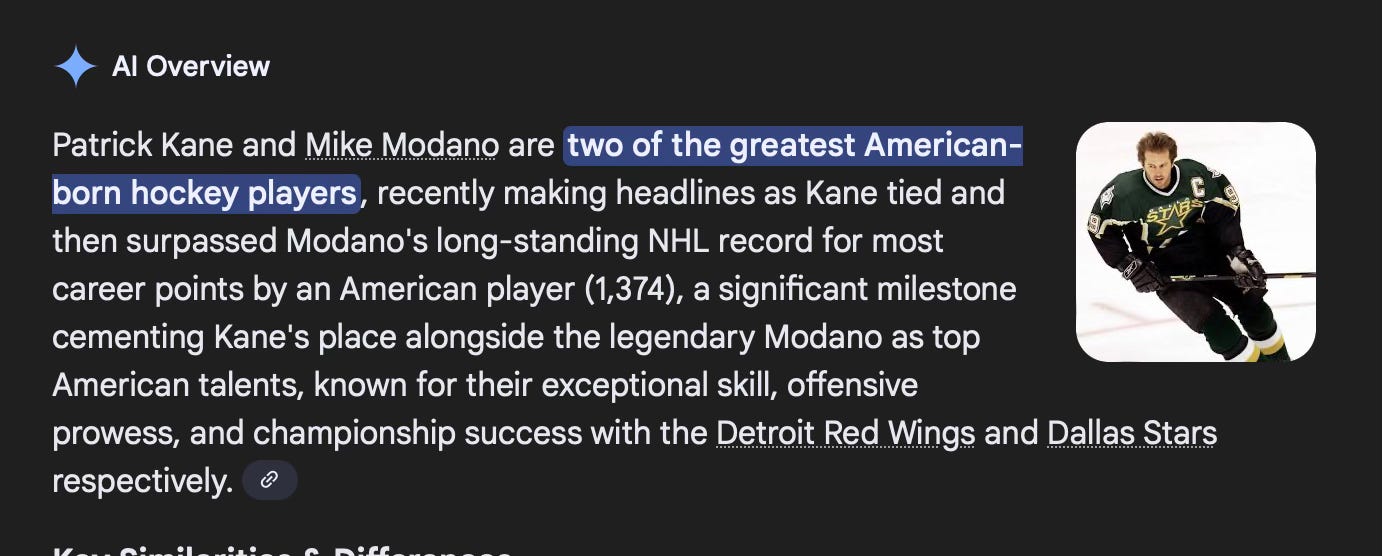 Contrary to what Google’s Artificial Intelligence will tell you, Patrick Kane still has yet to surpass Mike Modano for most points in NHL history amongst American-born players.