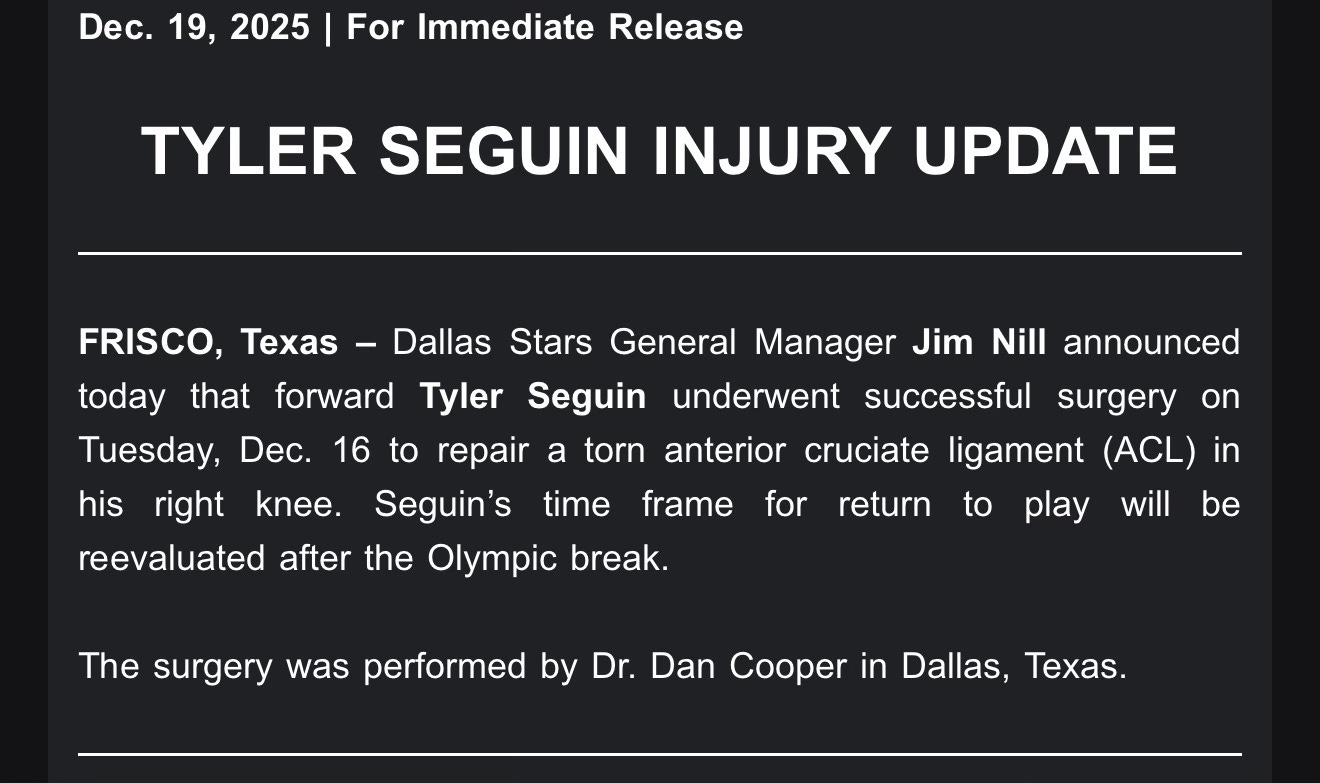 I’m telling you this story because the Dallas Stars officially announced today that Tyler Seguin had surgery to repair a torn ACL on Tuesday. The surgery was performed by Dr. Dan Cooper, one of the highest-profile orthopedic surgeons who one day earlier did a similar surgery on Kansas City Chiefs quarterback Patrick Mahomes left knee.