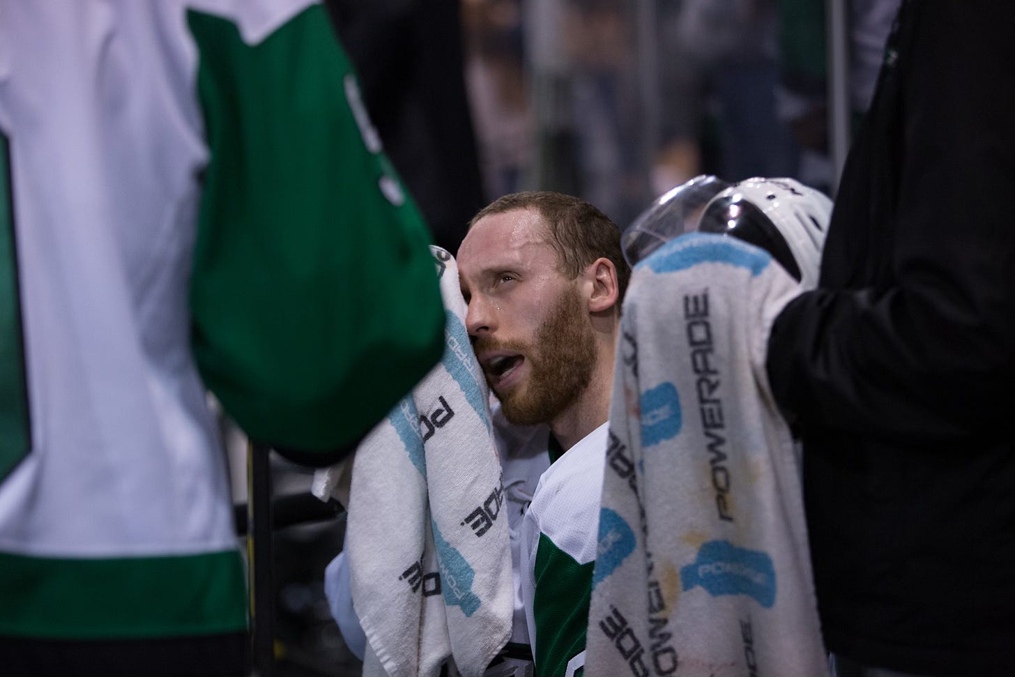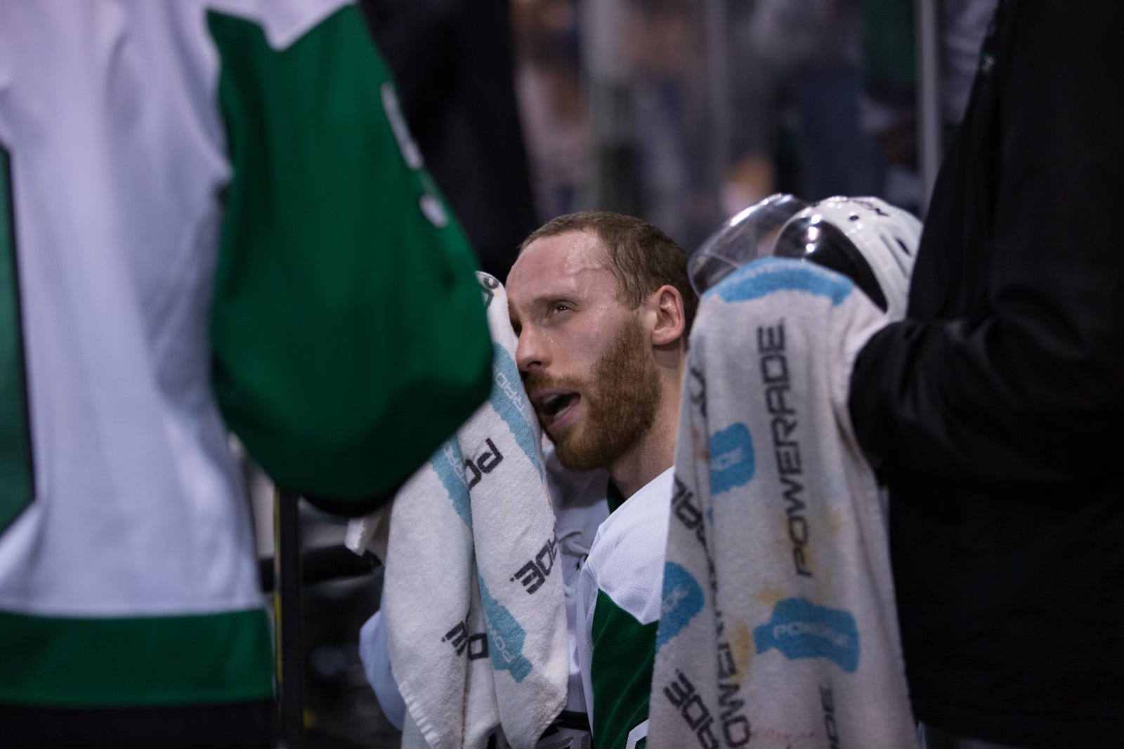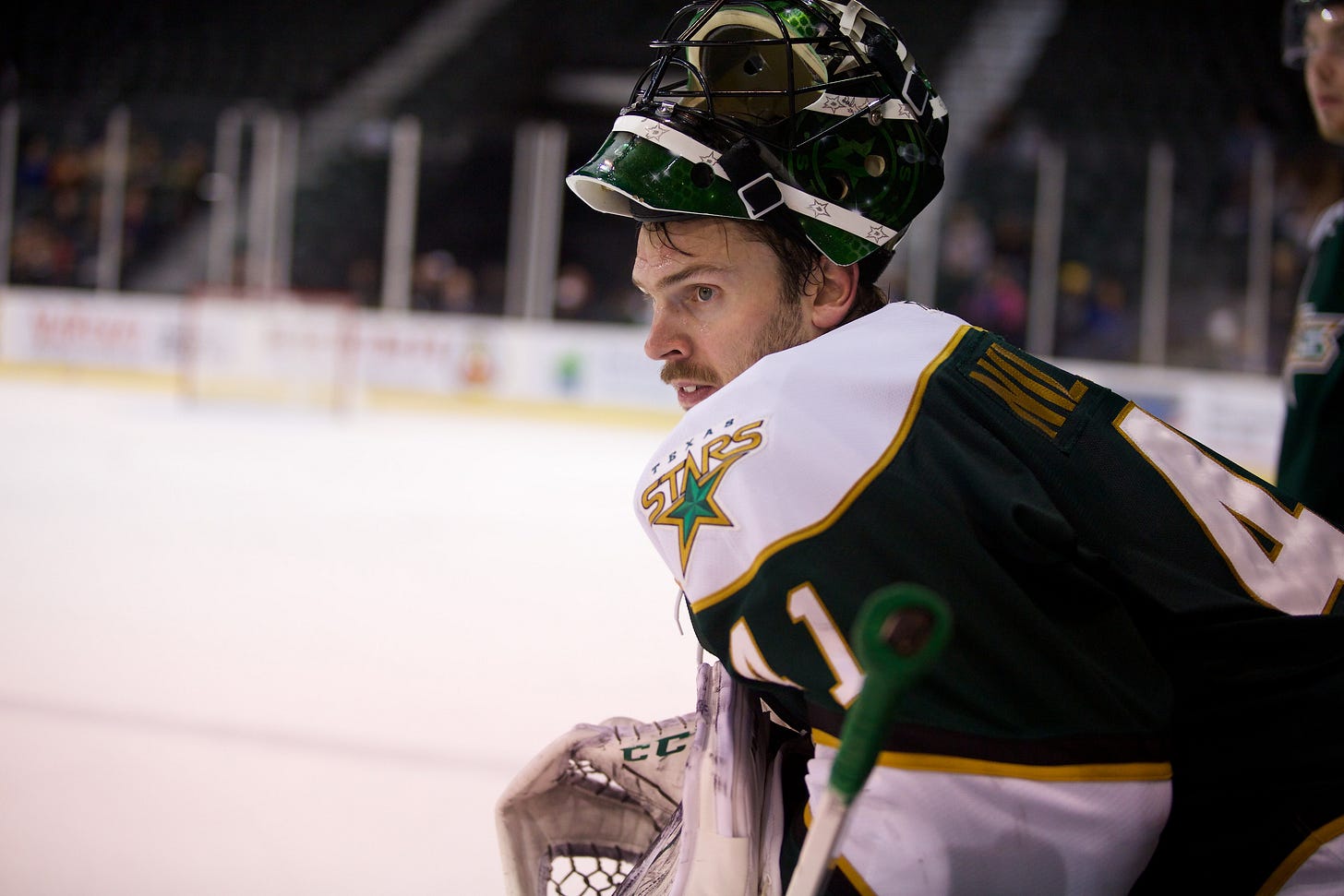 Christina found the human beings amongst the chaos. This photo, for example, of former Texas Stars goalie Cristopher Nihlstorp watching from the bench, having been pulled for an extra attacker, tells a human and game story in one.