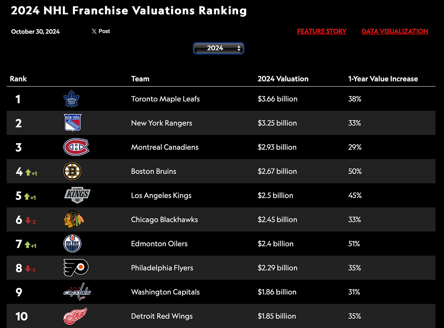The three most valuable franchises remain the ones you’d expect — the Toronto Maple Leafs, New York Rangers, and Montreal Canadiens — with the Boston Bruins and Los Angeles Kings jumping over the Chicago Blackhawks to round out the top five.